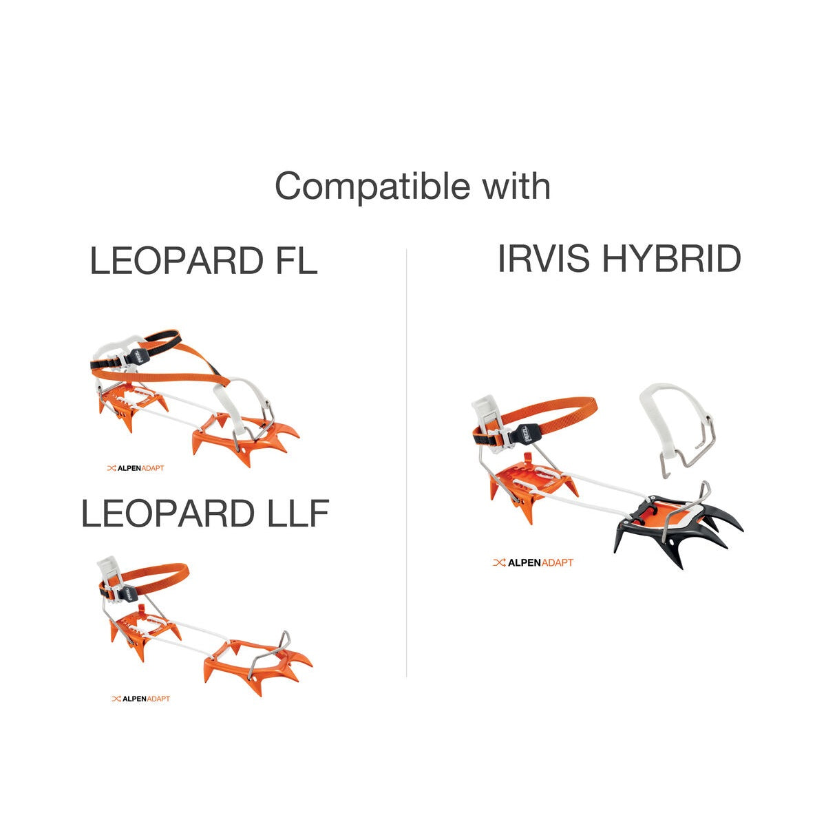 - Compatible with LEOPARD (T01A FL, T01A LLF and U004XA00), IRVIS HYBRID (T02A LLU and U031AA00) crampons and the KIT CORD-TEC (U001GA00)